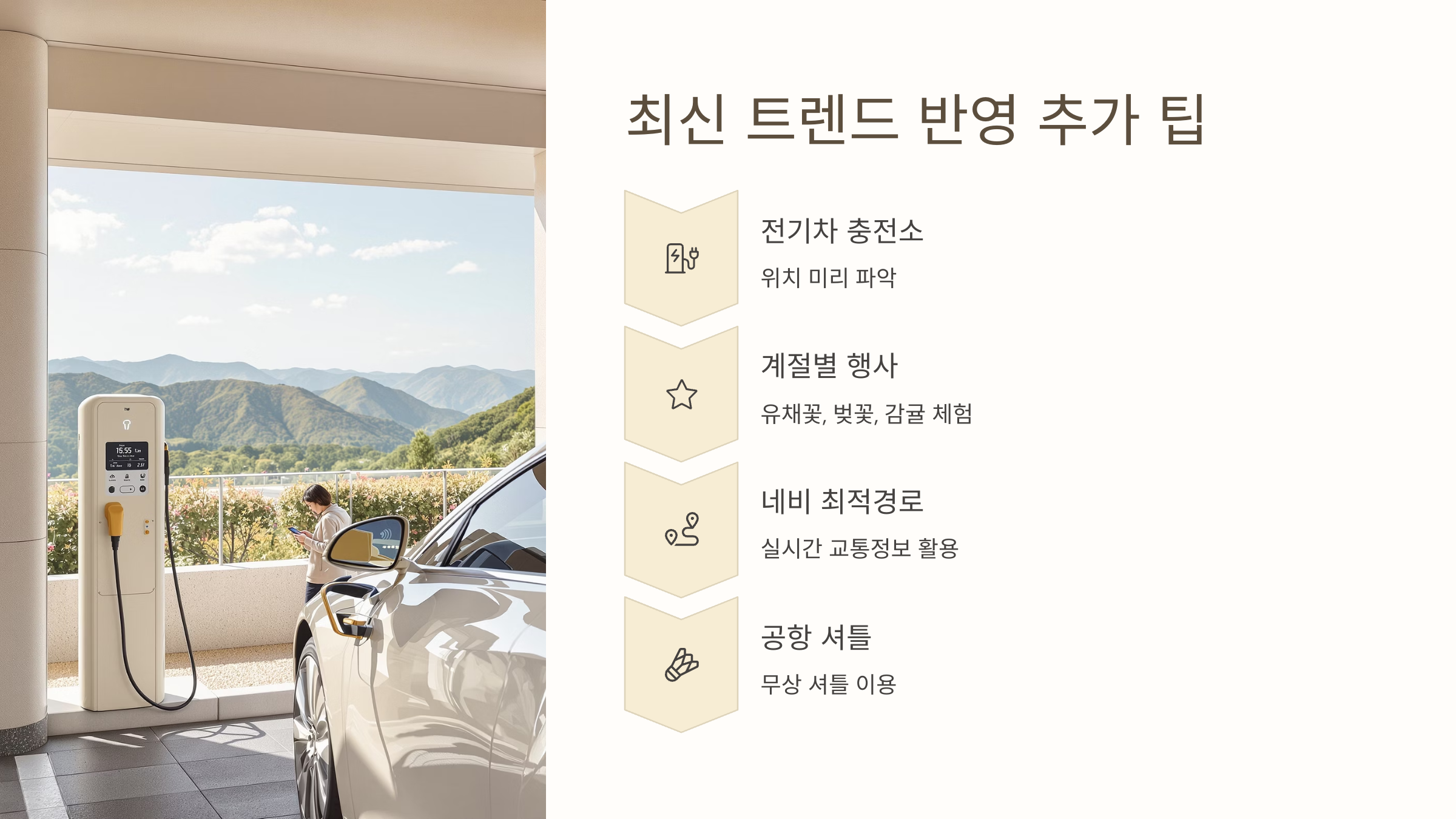 최근 제주 여행은 ‘스마트 여행’으로 진화 중이에요. 실시간 네비게이션, 전기차 충전소 정보, 계절별 축제 체크는 필수죠!