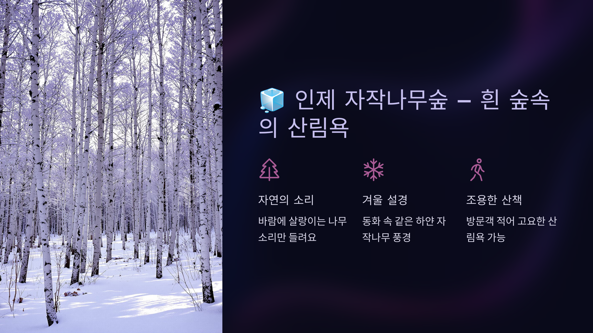 인제 자작나무숲은 그야말로 '조용함의 끝판왕'이에요. 특히 겨울에 눈 내린 자작나무 숲에 들어서면, 마치 북유럽 숲속을 걷는 기분이 들어요. 바람 소리, 눈 밟는 소리, 새소리만 존재하는 그 공간에서, 걷는 것만으로도 마음이 정화되는 경험을 하게 돼요. 어느 계절이든 좋지만, 개인적으로는 눈 내린 겨울이 가장 힐링이었어요.