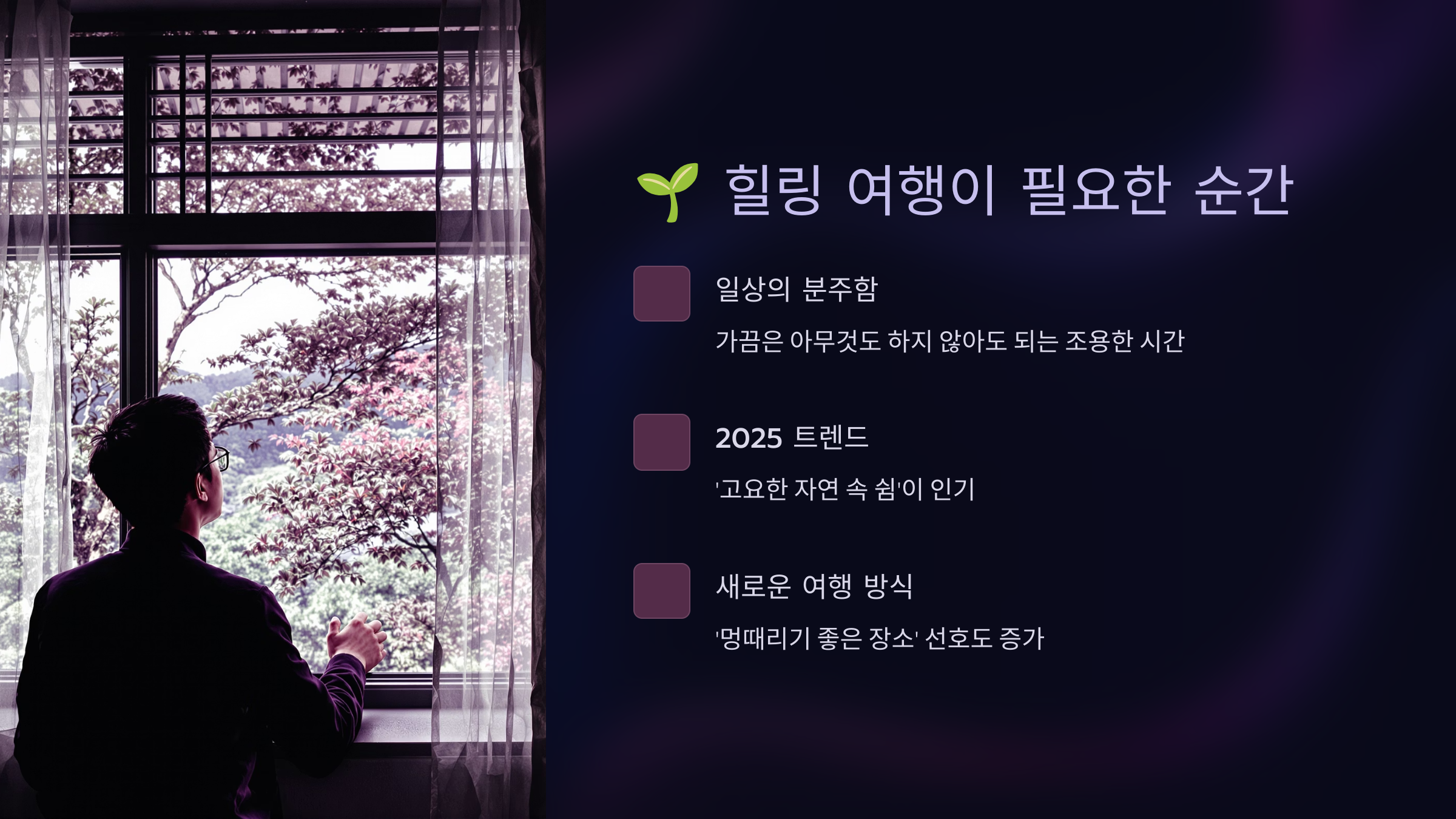 바쁘게 돌아가는 일상 속에서 어느 순간, 마음이 '그만 좀 쉬자' 하고 말을 걸 때가 있어요. 친구들과의 수다도, 좋아하는 콘텐츠도 위로가 되지 않는 날. 그럴 땐 고요한 자연 속으로 자신을 던져보는 것도 하나의 방법이 되죠. 최근 국내 여행 트렌드는 단순한 관광지를 넘어선 '쉼터 같은 공간'으로 이동 중이에요. 관광보다 명상, 맛집보다 멍때리기를 선택하는 사람들이 늘고 있어요. 이건 단순한 유행이 아니라, 우리가 살아가는 방식에 대한 작은 변화 아닐까요?