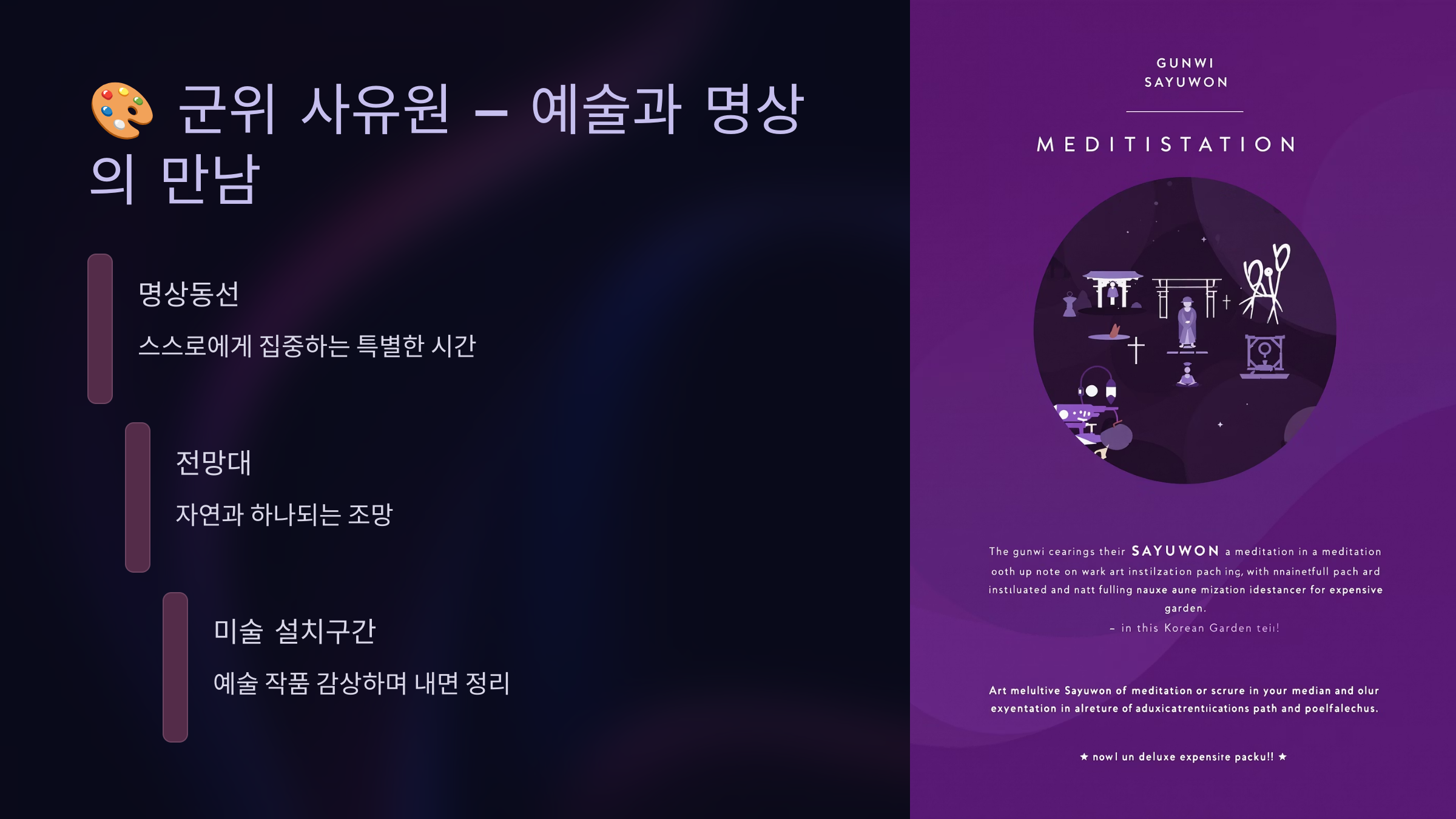 경북 군위에 위치한 사유원은 이름 그대로 '생각하고 머무는 정원'이에요. 예약제로 운영되기 때문에 복잡하지 않고, 자연 속에 조용히 자리 잡은 조형 예술품들을 따라 걷다 보면 어느새 마음이 정돈돼요. 전망대에서 내려다보는 자연은 그 자체로 그림이고, 명상동선은 정말 '나와의 대화'를 가능하게 해줘요. 인생에 지친 어느 날, 이곳은 아주 훌륭한 쉼터가 됩니다.